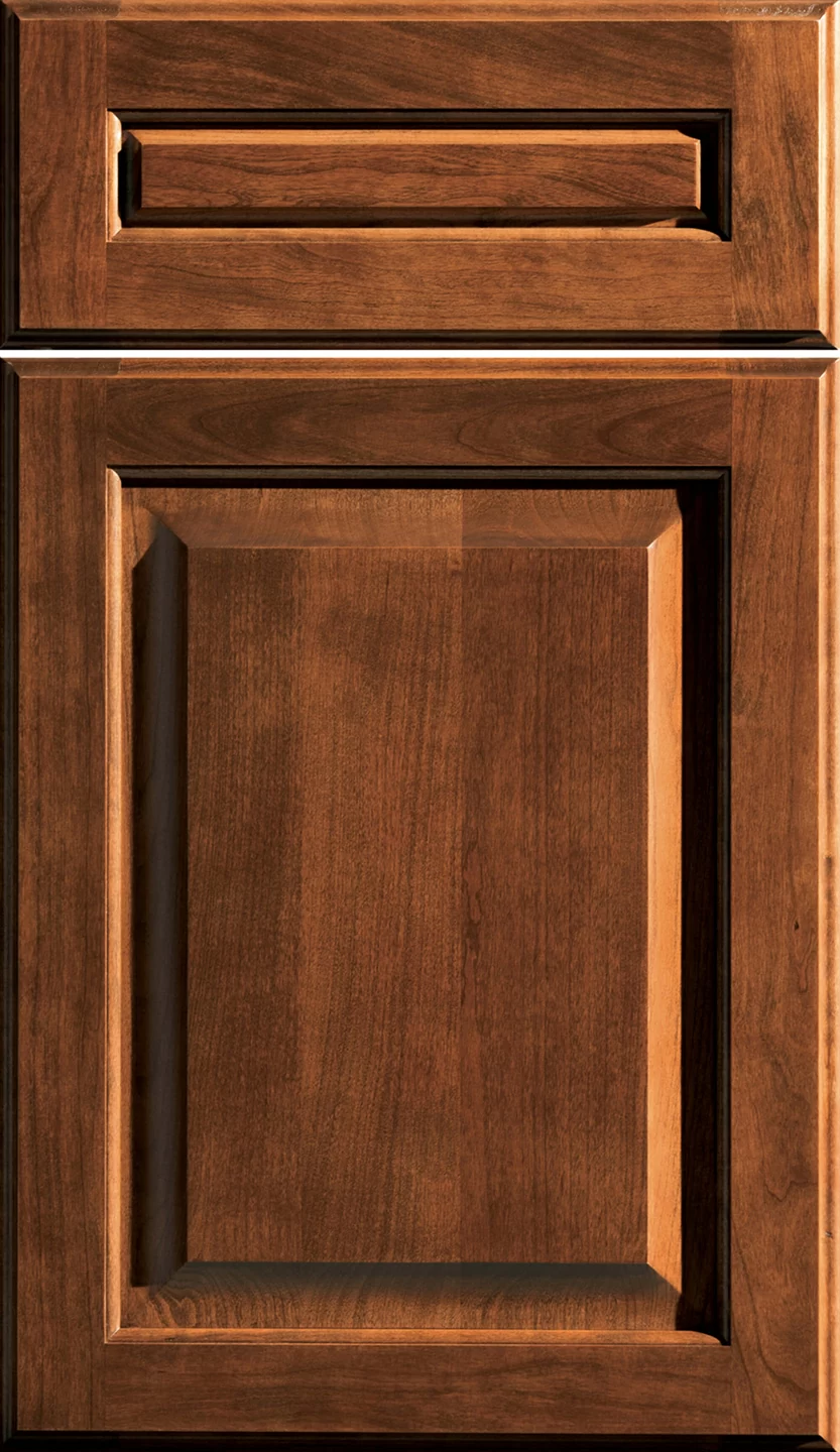 Cherry Raised Panel Full-Overlay Cabinet Cherry hardwoods are admired for their rich, beautiful color, satiny smooth texture, and uniform grain pattern. Cherry is one of our most popular wood species for kitchen cabinetry and the color will range from light to medium reddish-brown with some areas of light creamy color. Small mineral flecks, pitch pockets, and areas of sapwood occur naturally. The rich color of Cherry hardwoods will darken with age and exposure to sunlight.