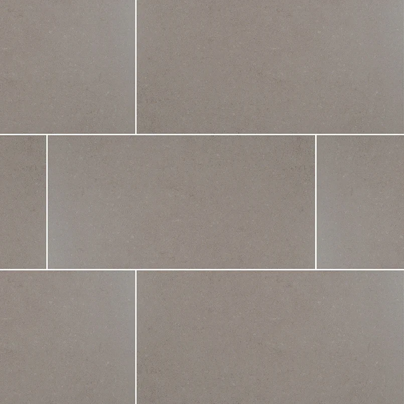 Porcelain Matte Tile Gris Porcelain Tile looks like traditional poured gray concrete, but has the easy care and durability of porcelain tile. Contemporary, elegant and sleek, these tiles are ideal for a contemporary design aesthetic to create floors, backsplashes, and countertops. Available in large format 12x24, 24x24, 2x2 and 4x12 bull nose tiles for installation flexibility.