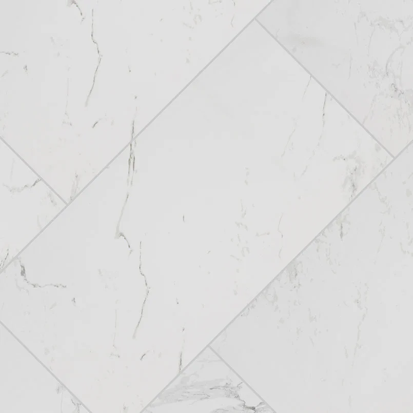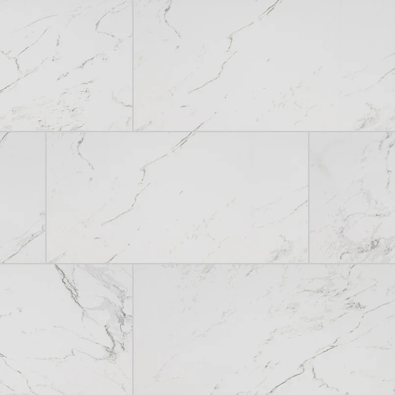 Porcelain Matte Tile Carrara porcelain tiles from the Pietra collection feature the same dramatic gray veins of natural marble, in an easy care porcelain tile that never need sealing. Available as large format 12x24 tiles in both polished and matte finishes, these tiles are suitable for a variety of projects including countertops, floors, and accent walls.