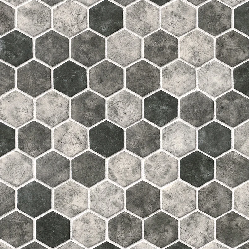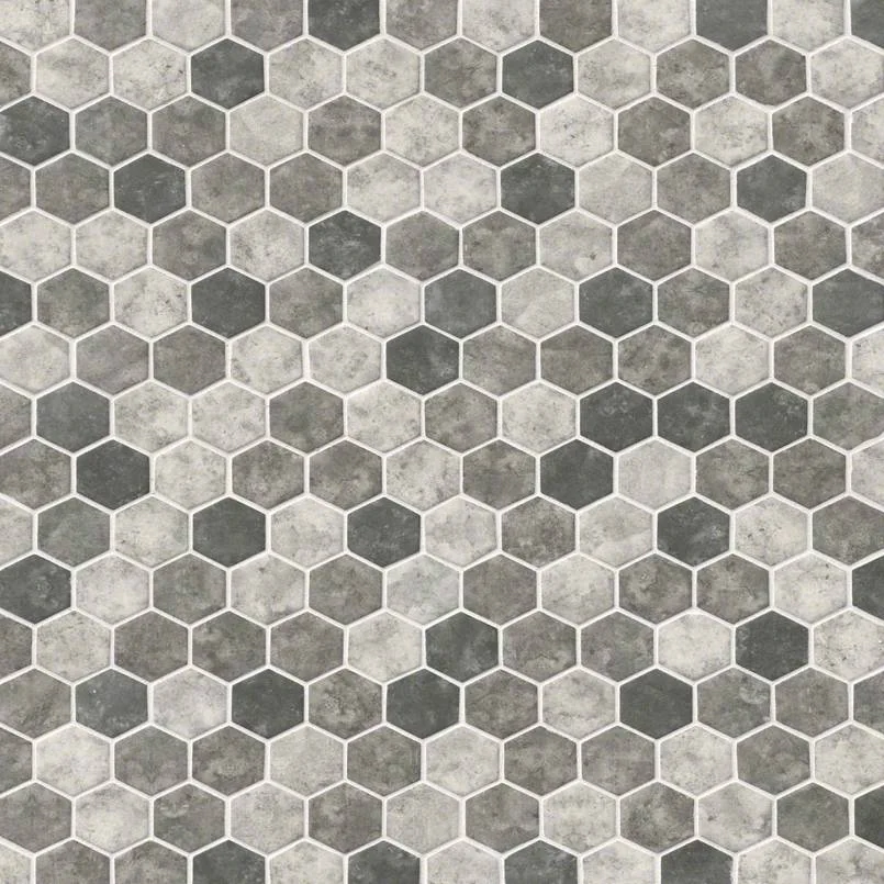 Glass Mosaics Tile Urban Tapestry Hexagon Tile is a 2 inch recycled glass mosaic backsplash tile that strikes the perfect balance between traditional and contemporary with neutral colorways of soft gray, creamy white, and deep charcoal. Durable, low-maintenance, and highly versatile, this mosaic gives residential and light commercial spaces a touch of visual intrigue. It’s perfectly suited for a kitchen backsplash, but why stop there? You can also use it on countertops, accent walls, shower walls, or to give a nook distinct personality. This tile is Greenguard Indoor Air Quality Certified® and comes mounted on mesh-backed sheets for a simplified installation and professional finish.